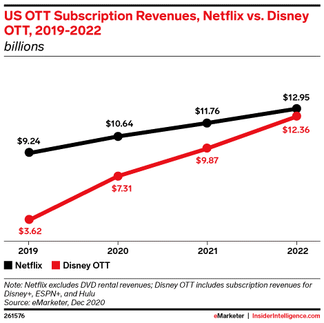 迪士尼+,再加上Hulu(迪士尼于2019年收购了Hulu),将使迪士尼成为今年订阅收入第二高的流媒体公司。到2022年,其收入将与Netflix相等,Netflix为129.5亿美元,迪士尼为123.6亿美元。