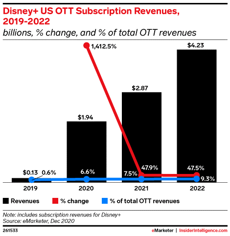 到今年年底,迪士尼+的订阅收入将达到19.4亿美元。随着最近宣布的明年1美元的价格上调,它将在未来两年的每一年中再增加10亿美元的收入。到2022年,这一数字将跃升至42.3亿美元。