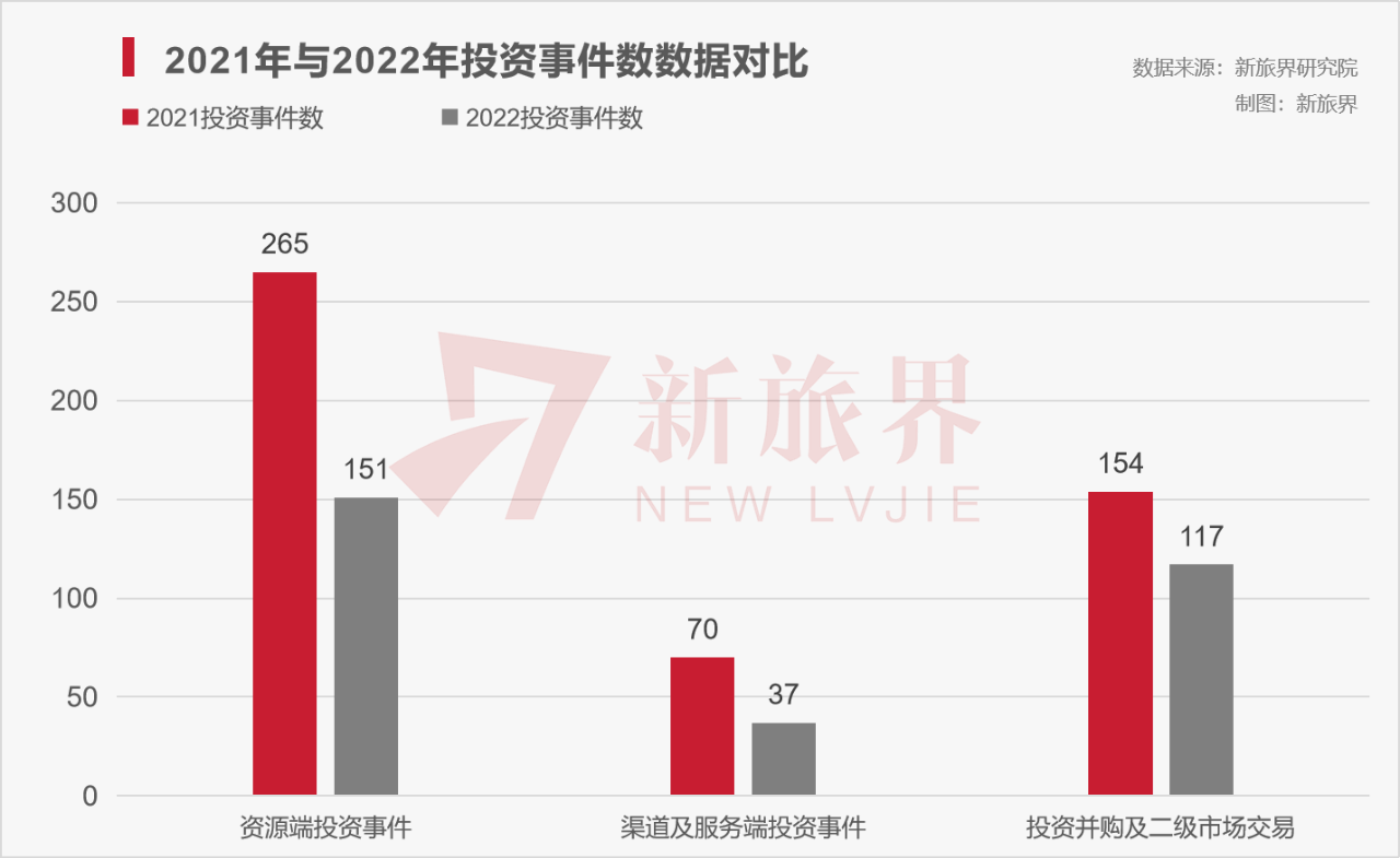 2022年,新旅界研究院统计到的投资事件数总计305起,仅是2021年489起的60%。其中,重资产资源端投资事件151起,为2021年的约57%;渠道及服务端投资事件37起,为2021年的53%;投资并购及二级市场交易事件117起,为2021年的76%。