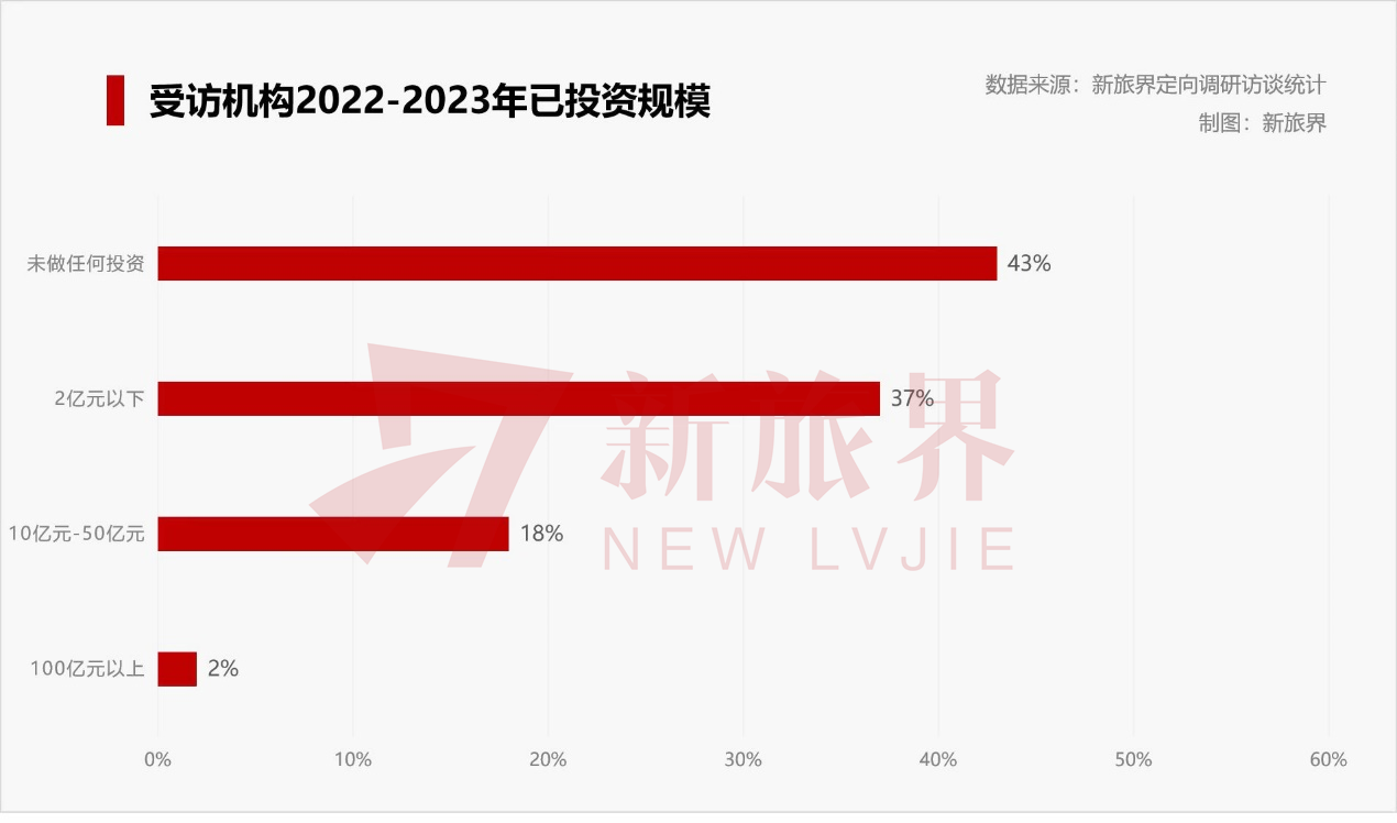在这样的大背景下,文旅企业对投资非常谨慎。近日,新旅界在调研访谈2022-2023年度中国文旅产业投融资情况时发现,目前参与访谈的旅企超40%在2022年未做投资,约1/3在2023年暂无投资计划,以消化存量与观望市场为主。