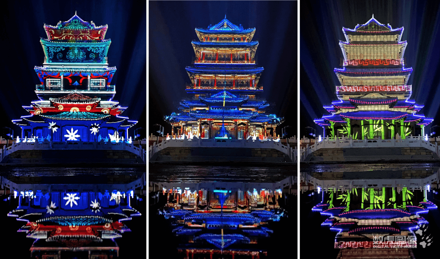 灯光秀:结合建筑或自然景观条件,以及活动主题,运用3D结构投影融合技术、三维制作技术,为建筑景观、自然风景增添新的生命力。