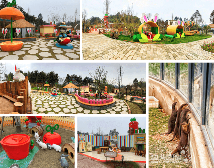 兔子庄园:集观赏性、互动性、娱乐性为一体的兔子庄园。萌兔形象设计的场景、兔窝、雕塑,搭配无动力设备及精心设计的植被景观,让人瞬间融入兔兔们的童话世界。