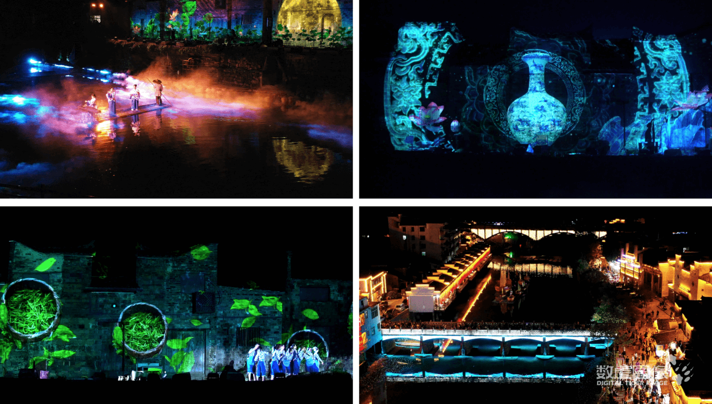 夜游:根据主题公园、旅游景区、特色小镇特性,打造森林公园夜游、3D建筑投影秀、灯光秀、实景水秀、山水实景演艺、沉浸式光影艺术等。