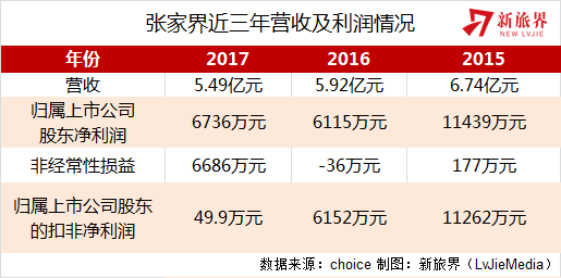 4月2日,张家界发布2017年财报,展示了过去一年的经营成果。财报显示,2017年营收5.49亿元,同比减少7.18%,归属上市公司股东的净利润6736万元,同比增长10.15%。粗略来看,这算得上还不错的业绩,虽然营收略有下滑,但净利润以两位数同比增长。