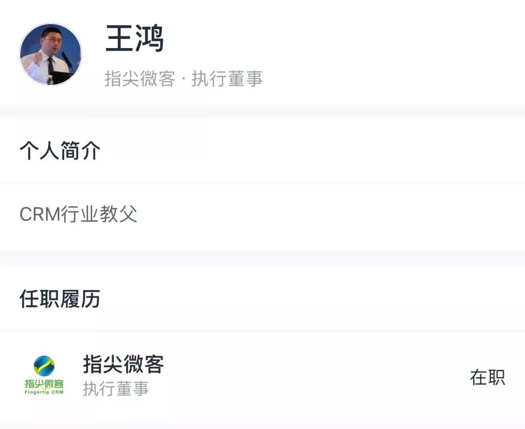 但“指尖微客”并不是王鸿在CRM领域的出道之作,媒体报道中曾这样描述王鸿:“这个拥有十余年CRM经验的资深业内专家,自2013年开始触电并实践微信营销的各种新技术……”这也意味着,王鸿在指尖微客之前已经在CRM领域颇有名气了。