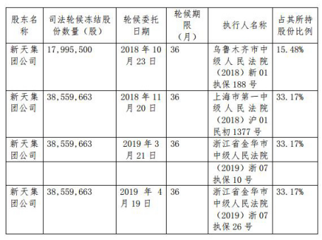 根据中登公司下发的《证券轮候冻结数据表》,股东新天国际所持股权1799.55万股被乌鲁木齐市中级人民法院以(2018)新01执保188号司法轮候冻结,轮候冻结的委托日期为2018年10月23日,轮候期限为36个月。新天国际所持股权3855.97万股被上海市第一中级人民法院以(2018)沪01民初1377号轮候冻结,轮候冻结的委托日期为2018年11月20日,轮候期限为36个月。新天国际所持股权3855.97万股被浙江省金华市中级人民法院以(2019)浙07执保10号轮候冻结,轮候冻结的委托日期为2019年3月21日,轮候期限为36个月。新天国际所持股权3855.97万股被浙江省金华市中级人民法院以(2019)浙07执保26号轮候冻结,轮候冻结的委托日期为2019年4月19日,轮候期限为36个月。