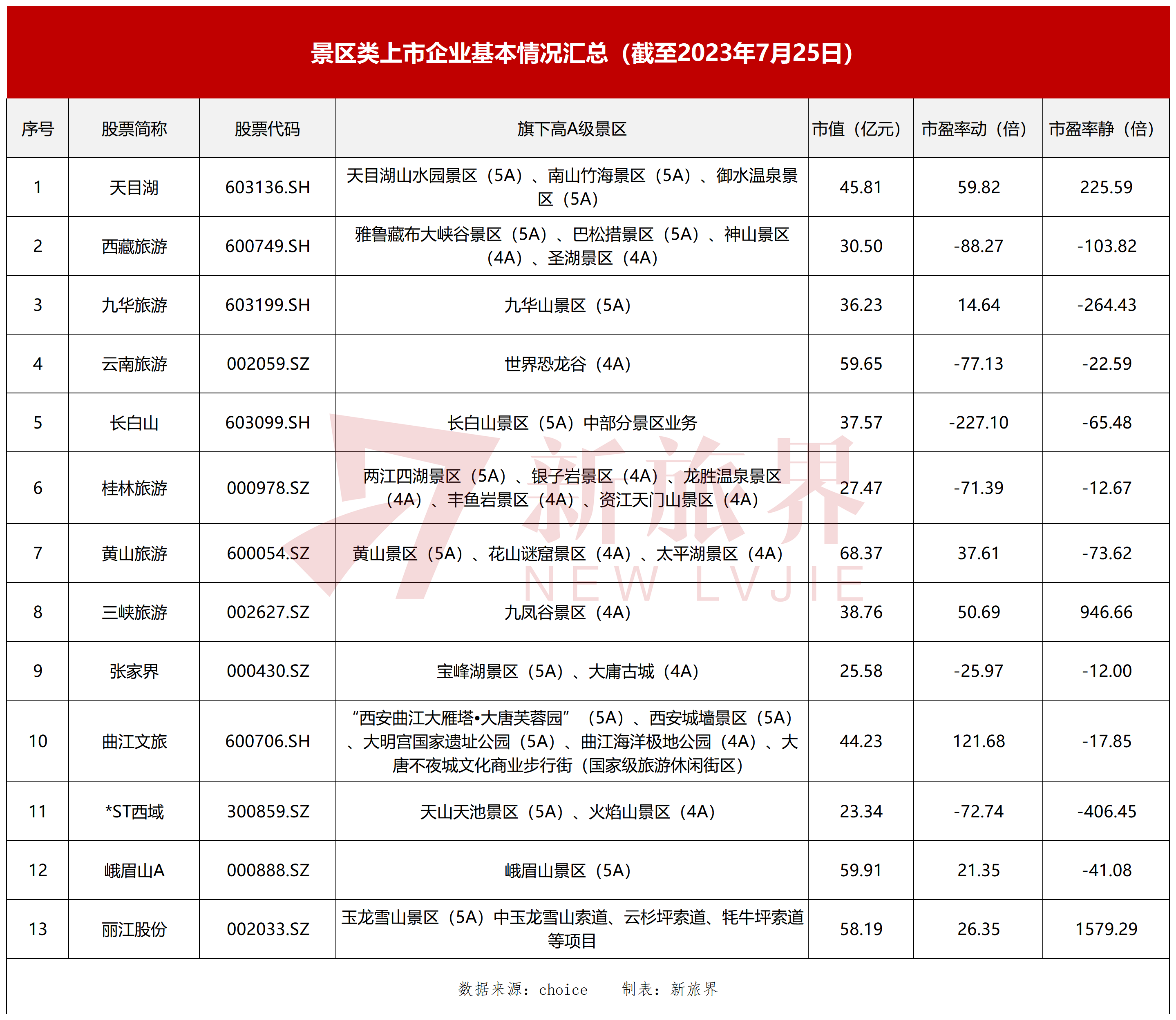 新旅界重点梳理关注了13家典型景区类上市企业。目前已上市的典型景区类企业,大致可分为两类:一类是基于规模经济的成本领先景区类上市企业;一类是休闲度假景区类上市企业。