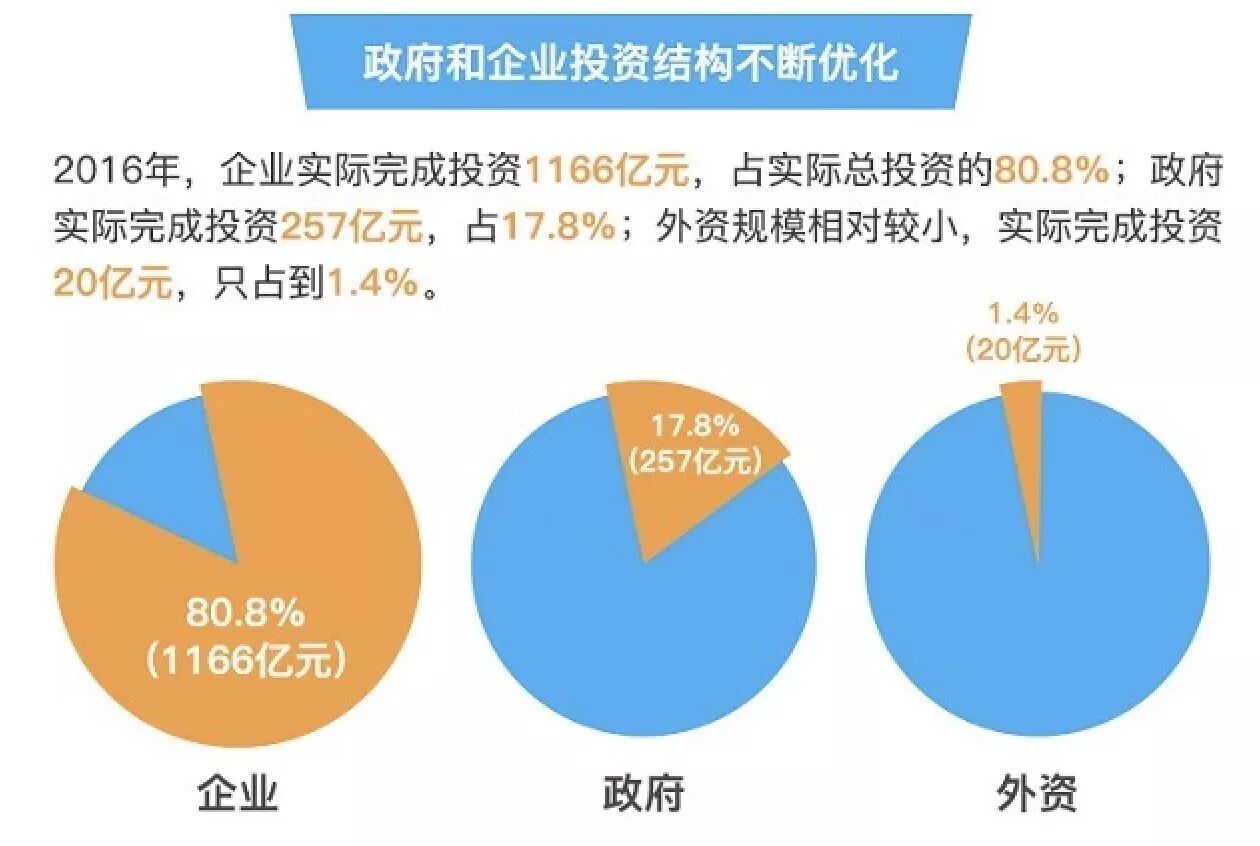 2016年,民营企业完成投资754亿元,同比增长30%,占全省实际完成投资的52%,对全省旅游投资的增长贡献率达到51.5%;国有企业加大旅游投资力度,完成投资312亿元,同比增长50%,占全省实际完成投资的22%,对全省旅游投资的增长贡献率达到30.9%。