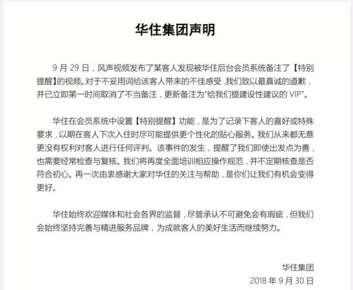 9月30日,华住针对此事发布声明指出,“对于不妥用词给该客人带来的不佳感受,我们致以最真诚的道歉。并已立即第一时间取消了不当备注,更新备注为‘给我们提建设性建议的VIP’”。