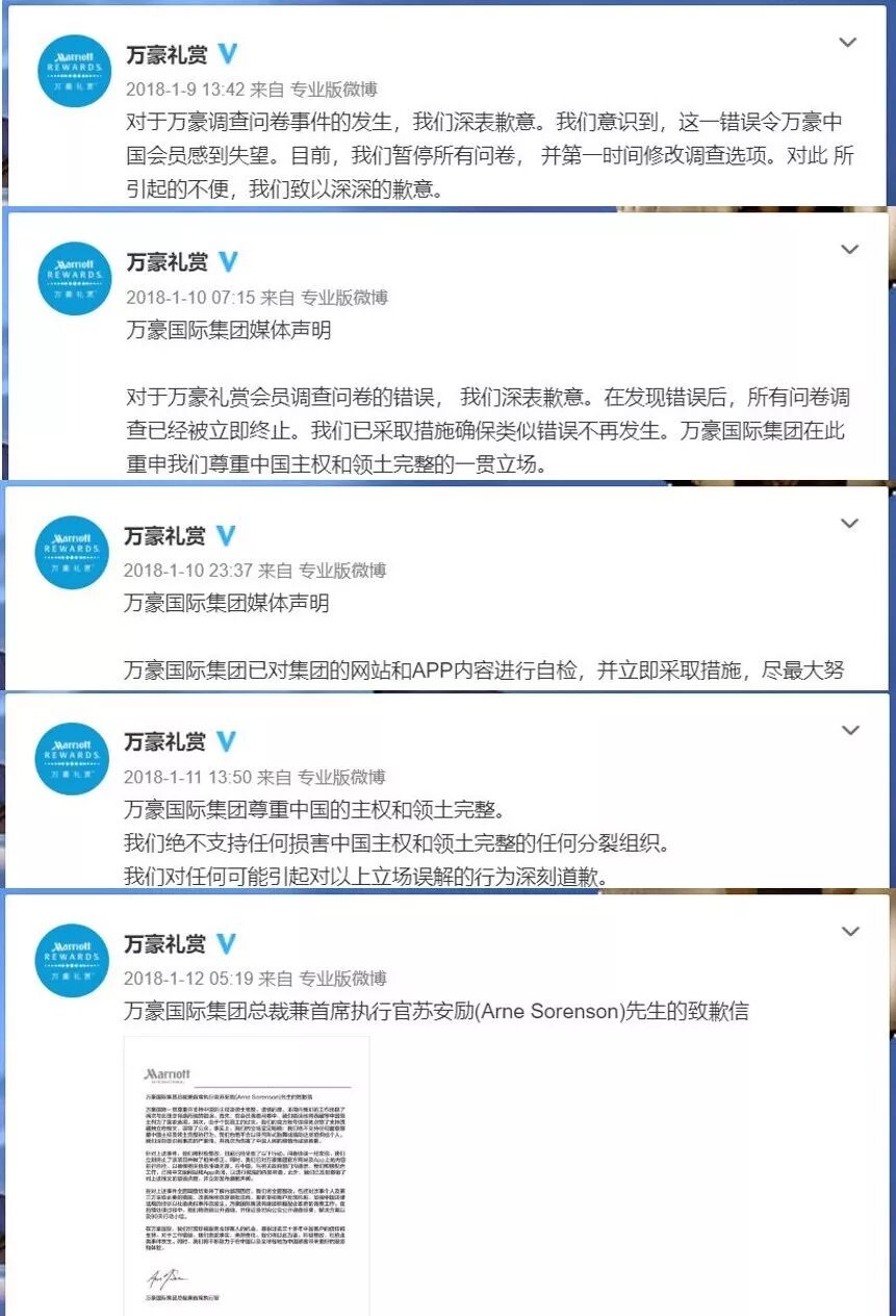 从1月9日下午微博用户@万豪礼赏首次不痛不痒的发文致歉,到12日早晨5时许,@万豪礼赏 发布集团总裁兼首席执行官的致歉信,万豪国际酒店就此事先后一共5次发表道歉,但首次道歉后转身却给一条“藏独”推特点赞的行为令其后续的4条道歉都显得有些亡羊补牢。