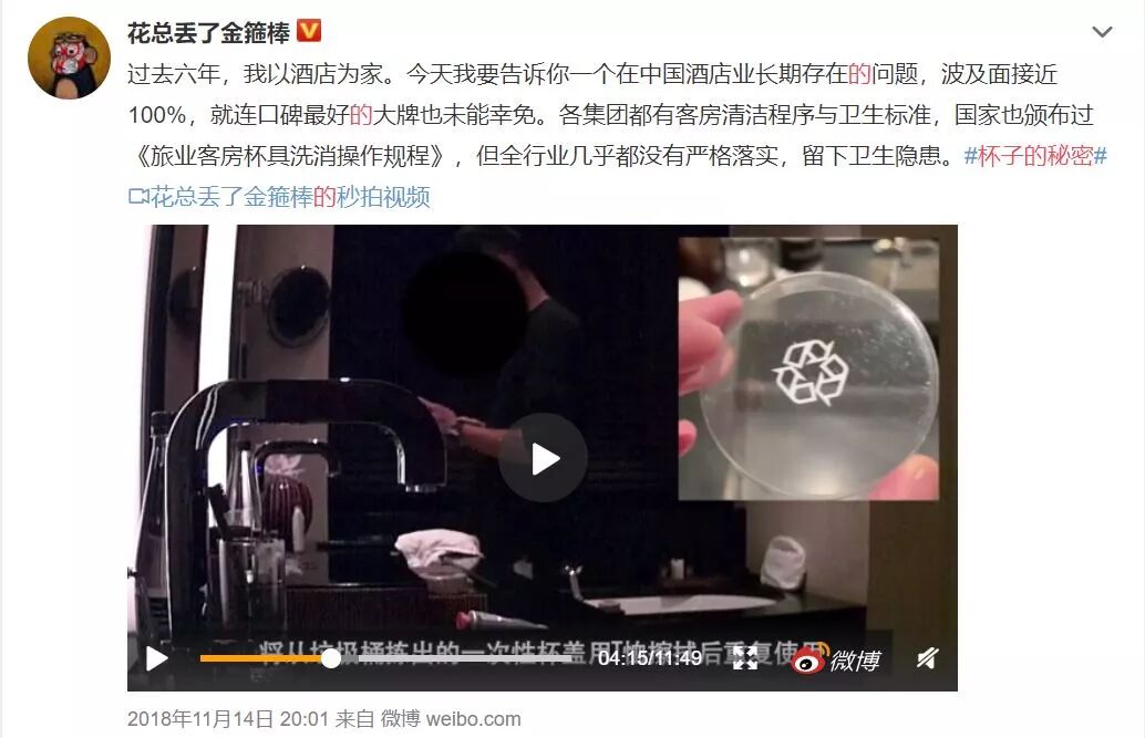 2018年11月14日,微博名为“花总丢了金箍棒”(以下简称“花总”)的网友发布了一段时长约12分钟的的视频——《杯子的秘密》,揭露多家五星级酒店卫生乱象,引起一片哗然。