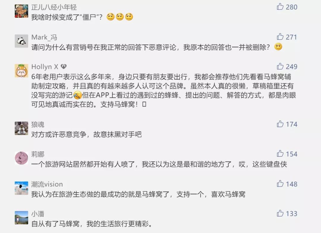 截至本文发布时,“小声比比”的两篇指马蜂窝搬运评论的推送并未删稿,但仍有微信的争议提醒。“小声比比”推文留言中,不少网友指出流量造假几乎已成互联网平台公开的秘密,而马蜂窝声明下的留言区则聚集了一批马蜂窝忠实用户,表示自己不是抄袭账号、马蜂窝攻略质量很高、怀疑马蜂窝被竞争对手恶意抹黑……“小声比比”文中指出的若干诡异的数据分析结果尚未有合理解释。看来,进一步的真相只有等待法院判决给出,在此之前,我们是等不到任何一方的道歉了。