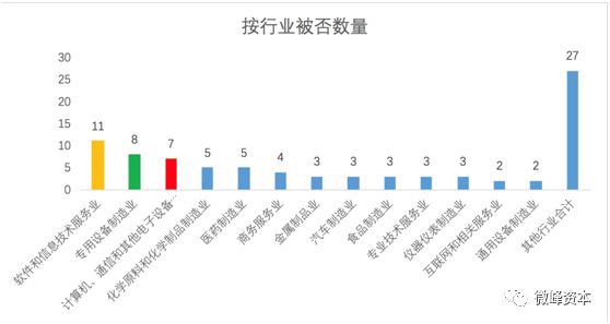 软件和信息技术服务业被否最多,达到11家,占比12.79%,其次为专用设备制造业8家,以及计算机、通信和其他电子设备7家。